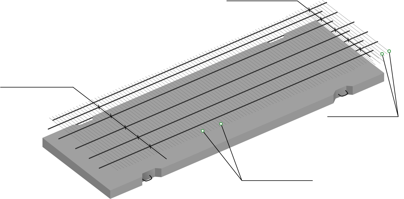 Армирование дорожных плит ПДН-14 выполняется с использованием верхнего слоев, каждый из которых состоит из 5 стержней. Стержни располагаются параллельно друг другу, обеспечивая жесткость конструкции. Для повышения прочности между слоями укладывается армирующая сетка, которая связывает слои и предотвращает деформации. Такая конструкция обеспечивает высокую несущую способность плиты и устойчивость к динамическим нагрузкам.